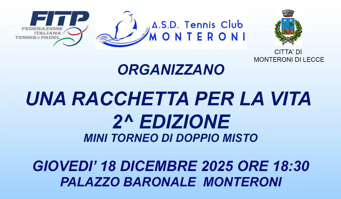 Sport, solidarietà e spirito natalizio si incontrano a Monteroni di Lecce con la seconda edizione di “Una Racchetta per la Vita”: un mini torneo di doppio misto che diventa gesto concreto di sostegno alla LILT, nel segno della prevenzione, della comunità e dei valori più autentici dello sport. Una Racchetta per la Vita: sport e solidarietà si incontrano a Monteroni
